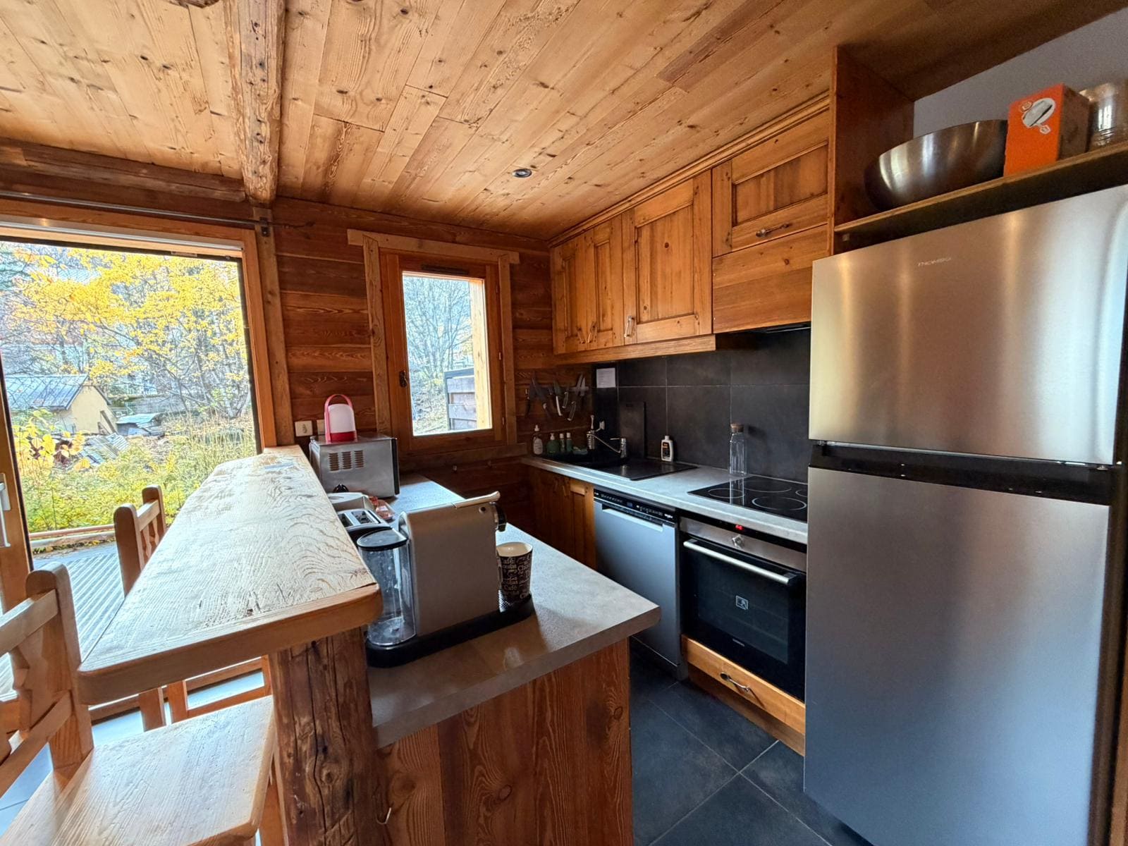 La cuisine de l’appartement La Nô allie charme montagnard et fonctionnalité moderne. Entièrement habillée de bois et baignée de lumière naturelle, elle offre un espace convivial et chaleureux, idéal pour préparer de bons repas après une journée en altitude.
