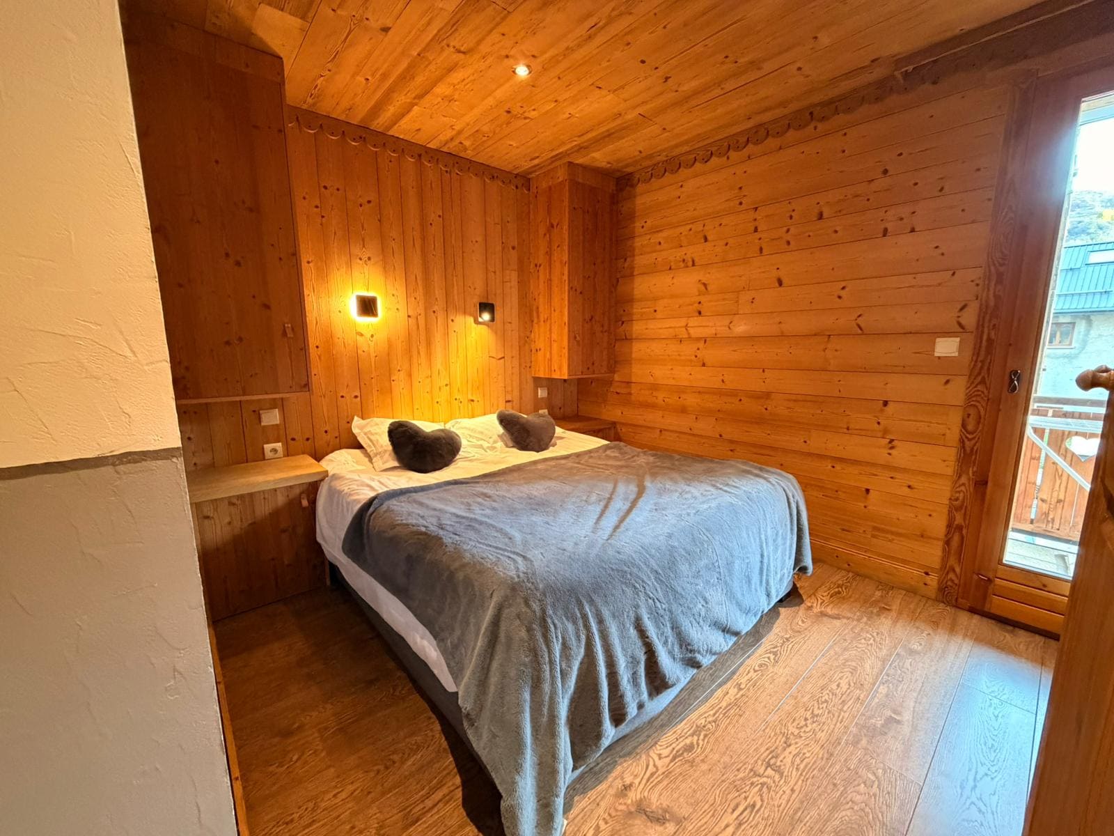 Cette chambre double de l’appartement La Nô est une véritable invitation au repos. Entièrement habillée de bois, elle offre une ambiance chaleureuse et apaisante, digne des plus beaux chalets alpins. Son lit 160×200 garantit des nuits confortables et réparatrices après vos journées en montagne.