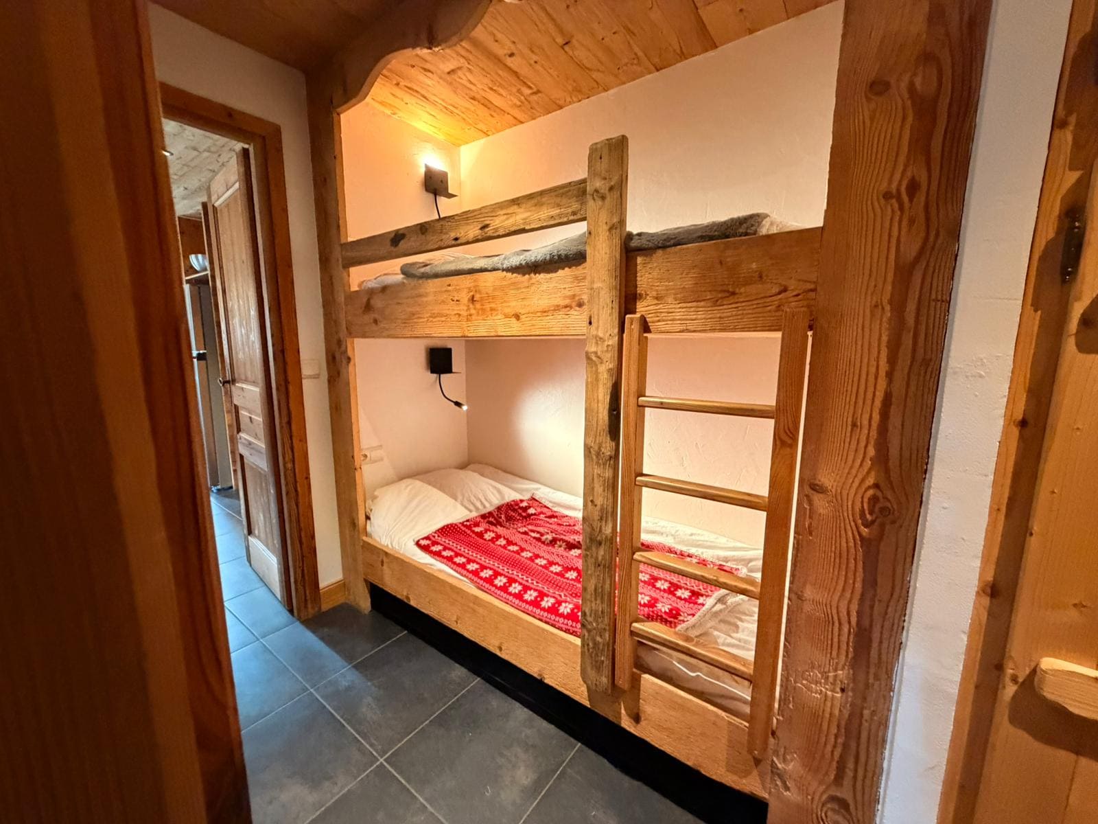 Ce coin montagne, typique des séjours en altitude, offre un espace nuit chaleureux et malin, idéal pour les enfants ou les amis. Niché dans un cadre en bois massif et équipé d’un lit superposé (80×200), il reprend les codes traditionnels des chalets alpins pour créer une ambiance authentique et cocooning.