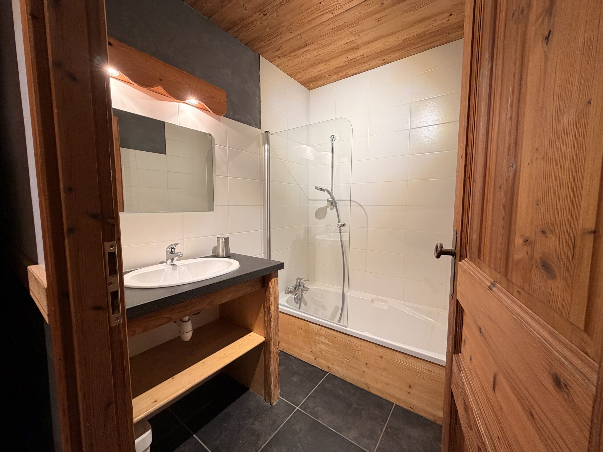Cette salle de bain de l’appartement La Nô offre un espace chaleureux et fonctionnel, pensé pour vous garantir des moments de relaxation après une journée en montagne. Habillée de bois et de matériaux naturels, elle reflète parfaitement l’esprit montagnard.
