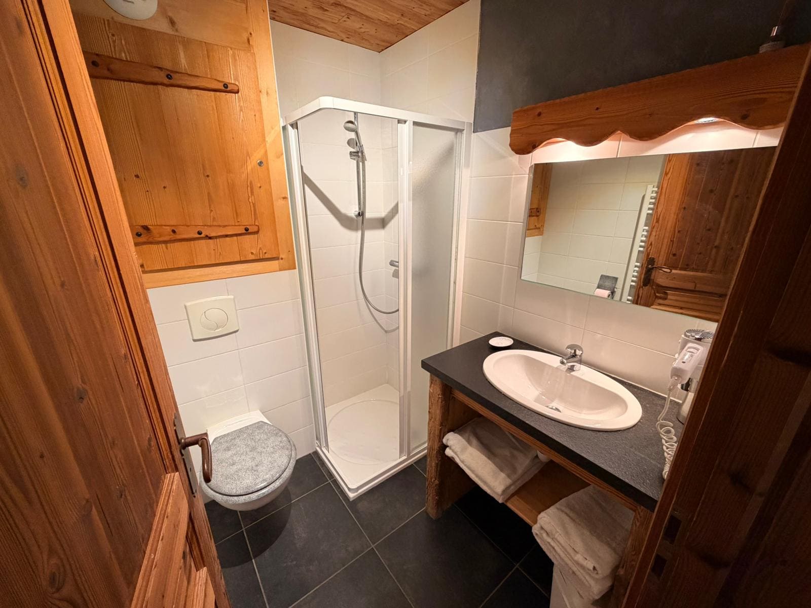 Elle dispose d’une baignoire, idéale pour se détendre au retour des pistes, d’une vasque moderne et d’un sèche-cheveux à disposition. Sobre et agréable, elle combine praticité et confort, pour un séjour tout en douceur.